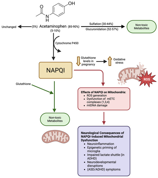 Acetaminophen metabolism and NAPQI-mediated mitochondrial effects leading to neurodevelopmental outcomes. Most acetaminophen is detoxified via sulfation and glucuronidation to form non-toxic metabolites (black arrows). A smaller fraction (5–10%) is metabolized by cytochrome P450 to NAPQI, which is normally neutralized by glutathione and converted to non-toxic conjugates (green arrows). During pregnancy, however, reduced glutathione levels increase vulnerability to NAPQI, which can result in mitochondrial oxidative stress, elevated ROS production, disruption of electron transport chain complexes I, III, and IV, and mitochondrial DNA damage (red arrow ending in red box). These effects on mitochondria contribute to neuroinflammation, epigenetic priming of microglia, impaired astrocyte-neuron lactate shuttling (relevant to ADHD), and neurodevelopmental disruptions that may manifest as ASD and ADHD symptoms (red arrow ending in a purple box). The image was generated by using BioRender.com.