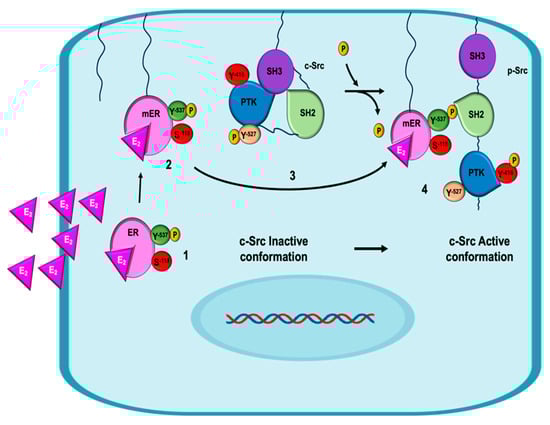 - Gui, Z.; Shi, W.; Zhou, F.; Yan, Y.; Li, Y.; Xu, Y. The Role of Estrogen Receptors in Intracellular Estrogen Signaling Pathways, an Overview. J. Steroid Biochem. Mol. Biol. 2025, 245, 106632. [Google Scholar] [CrossRef] [PubMed]