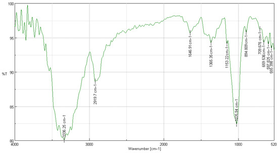 Fourier transform infrared spectroscopy was used to identify the functional groups present in cellulose isolated from Tibouchina lepidota with a particle size of 250 µm. The resulting spectrum (Figure 1) exhibits the typical bands of the O–H and C–H bond network of native cellulose, as well as the diagnostic signal of β-1,4-glucosidic bonds, confirming the preservation of the polysaccharide backbone after the extraction process [16].
