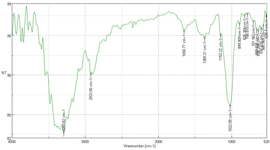 The FTIR spectrum obtained for cellulose isolated with a particle size of 125 µm. Figure 2 shows the diagnostic bands of a polysaccharide structure free of lignin and hemicelluloses, with slight variations compared to the 250 µm fraction, reflecting changes in the hydrogen bond environment [22].