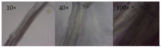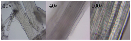Figure 4 integrates micrographs of cellulose from Tibouchina lepidota (125 µm particles) captured at 10×, 40×, and 100×. At 10×, a single, long, and slender bundle is recognized, whose sharp contour confirms the absence of chromogenic impurities associated with lignin or its extractives. This optical cleanliness suggests that the alkaline–acid stage applied to the fine material was equally effective as the levels noted in the coarse fraction [31].