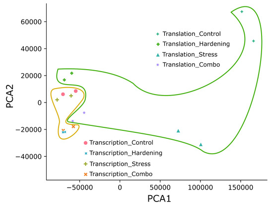 We applied the principal component analysis (PCA) to form a first impression of the data and to reduce the dimensionality of the data. The principal component distribution (Figure 1) shows that all experimental samples fall into two groups: samples reflecting transcriptional dynamics and translational dynamics. In our opinion, the compact subclustering of transcripts from hardened plants (Hardening and Combo) separately from control and stressed plants can be explained quite simply—hardening is a time-consuming process, unlike the short-term stress exposure used in this study. That is, the model plants under conditions of low positive temperatures had time to change the expression profile at the transcriptome level, whereas plants exposed to short-term low temperatures did not have such an opportunity. In general, transcripts from total RNA (matched transcription) also formed a significantly more compact cluster than translational samples (polysome fraction). This pattern may be partly explained by the greater lability of translation in terms of regulation.