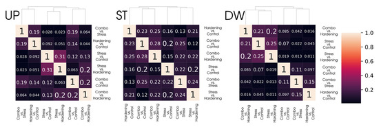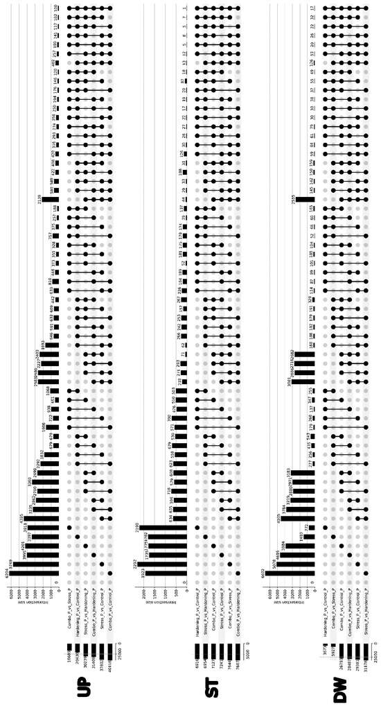 For the Up group, i.e., for genes with increased expression, we can note the size of the primary DEGs sets ranging from 3000 to 4000 genes, with the Combo_vs_Hargening and Stress_vs_Control comparisons falling out of this pattern, which can be explained in the same way as the distribution of PCA data—stress (in the presented experiment) is a short-term effect (2 h), which may not be sufficient to significantly alter the transcriptional profile. The Combo_vs_Stress, Combo_vs_Control, and Hardening_vs_Control samples show a curious similarity in the composition of DEGs, both when compared pairwise and jointly. If we keep in mind that the Stress sample is not significantly different from the Control sample and the Combo sample is not significantly different from the Hardening sample, it is not difficult to find an explanation for these results.