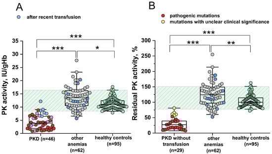 Pyruvate kinase activity in patients and healthy controls. (A) Pyruvate kinase (PK) activity in patients with anemias (red and gray dots represent patients with PK deficiency (PKD) and patients with other anemias, respectively, blue dots represent patients with recent transfusions) and healthy controls (green dots). (B) Residual PK activity in patients with PKD without recent transfusions (red and yellow dots represent patients with PKD with pathogenic mutations and mutation with unclear clinical significance, respectively), patients with other anemias (gray and blue, blue dots represent patients with recent transfusions) and healthy controls (green). Box plots: range 25–75 percentile, whisker range 2.5–97.5 percentile, median values—horizontal lines. Shaded area—reference interval (95% interval for healthy donors). *, **, ***—Differences between groups are significant at p < 0.05, p < 0.01, and p < 0.001, respectively (Kruskal–Wallis test, post hoc Dunn’s test).