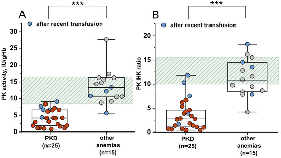 PK activity (A) and PK/HK ratio (B) in patients with PKD and other anemias. PKD—patients with pyruvate kinase (PK) deficiency (red), other anemias—patients with other anemias (grey dots). Blue dots—patients after recent transfusion; PK/HK ratio—ratio of PK activity to hexokinase (HK) activity. Box plots: range 25–75 percentile, whisker range 2.5–97.5 percentile, median values—horizontal lines. Shaded area—95% reference interval. ***—differences between groups are significant at p < 0.001 (Mann–Whitney test).