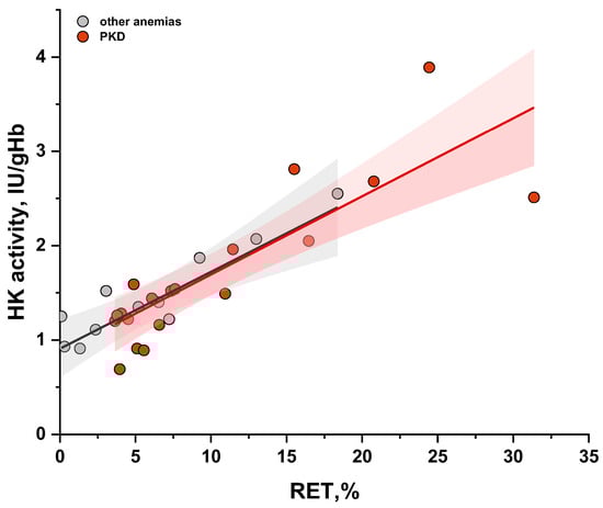 The relationship between measured hexokinase (HK) activity in erythrocytes and reticulocyte (RET) count in the blood in patients without recent transfusion. PKD—patients with pyruvate kinase deficiency (n = 20), red dots; patients with other anemias (n = 11), gray dots. The black (r = 0.79, p < 0.05) and red lines (r = 0.8, p < 0.05) represent linear fitting for other anemias and PKD, respectively, with 95% confidence interval (grey area for other anemias and red for PKD).
