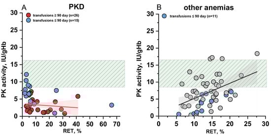 The relationship between pyruvate kinase (PK) activity in erythrocytes and reticulocyte (RET) count in the blood. (A) Patients with PK deficiency (PKD); (B) patients with other anemias. Blue dots—patients after recent red blood cell transfusions. The green shaded area on both panels represents the reference range for PK activity. The red and black lines represent linear fitting for PKD (r = −0.17 at p = 0.39) and other anemias (r = 0.42 at p = 0.0013), respectively, with 95% confidence interval (red area for PKD and grey for other anemias).