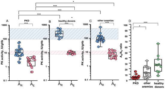 PK activity in reticulocytes (AR) and erythrocytes (AE) and AR/AE ratio for patients and healthy donors. AR—blue dots, AE—pink dots. (A) Pyruvate kinase deficiency (PKD), n = 24 and n = 18 for AR and AE, respectively; (B) healthy donors, n = 10 for AR and AE; (C) other anemias, n = 25 and n = 20 for AR and AE, respectively; (D) AR/AE ratio for PKD (red), n = 17; other anemias (grey), n= 16; healthy donors (green), n = 10. For patients with recent transfusions, AE data were excluded from the graph and calculations of the AR/AE ratio. Box plots: range 25–75 percentile, whisker range 2.5–97.5 percentile, median values—horizontal lines. The shaded areas represent the normal reference ranges for AR (blue) and AE (pink). *, ***—differences between groups are significant at p < 0.05 and p < 0.001, respectively (Kruskal–Wallis test with post hoc Dunn’s test or Mann–Whitney test).