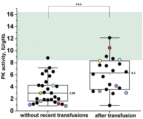 Pyruvate kinase (PK) activity in patients with PK deficiency without recent transfusions (left) (n = 29) and with recent transfusions (≤3 months prior to assay) (right) (n = 22). The same patients in the absence and presence of recent transfusion are indicated by identical colored dots. Box plots: range—25–75 percentile, whisker range—2.5–97.5 percentile, median values—horizontal lines. The shaded areas represent the normal reference range. ***—differences between groups are significant at p < 0.001 (Mann–Whitney test).