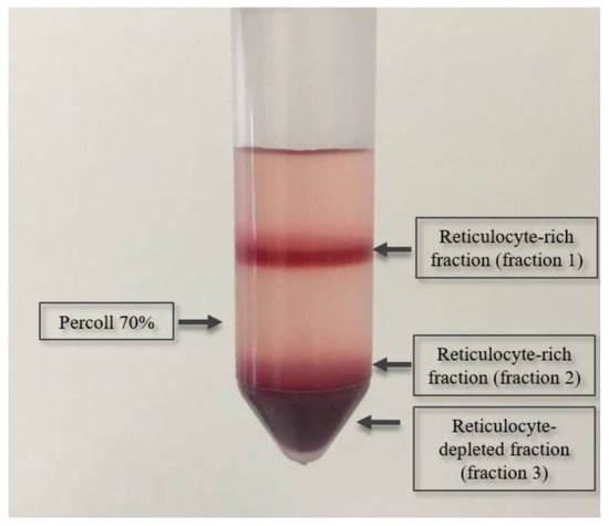 Separation of erythrocytes into fractions of different reticulocyte content was achieved by centrifugation in Percoll density gradient [32]. A suspension of erythrocytes purified from leukocytes was layered on 70% Percoll. After centrifugation (15 min at 1200× g, 30 °C), two layers of cells separated by a Percoll solution with different numbers of reticulocytes were observed in the density gradient (Figure 7). The maximum enrichment of the upper layer with reticulocytes reached 84% for patients and 19% for donors. From these two layers, 3 fractions of cells with different reticulocyte content were removed (Figure 7) and washed from Percoll by 3-fold centrifugation in PBS. The reticulocyte content in each fraction was determined using thiazole orange to stain the reticulocytes. Thiazole orange was added to erythrocyte suspensions containing reticulocytes and the samples were incubated for 30 min in the dark and then analyzed on a flow cytometer BD FACSCanto optimized for fluorescence quantitation in the visible region of the spectrum (488 nm). Hemolysates were prepared from each fraction for measuring PK activity for samples without reticulocyte isolation.