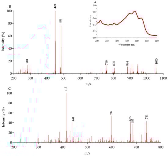 Likewise, the ESI-MS spectrum in positive mode of the TA showed peaks of highest intensity at 413 ([dihydrosqualene-H]+), 597 ([astaxanthin-H]+ []), 675 (tetra anhydro BR), 685 (tris anhydro BR), and 741 ([BR-H]+ [] m/z) (Figure 1C). Other peaks of lower intensity, such as 441 m/z [], have been ascribed to stable fragment ions.