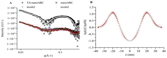 SAXS data of nanoARC and TA-nanoARC. (A) Log–log profiles with solid lines corresponding to model fits. (B) Electron density profiles derived from data fitting. n = 3.