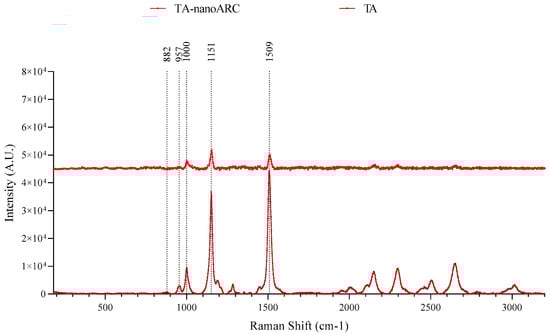The Raman spectrum of TA (Figure 3) showed BR at 1000 cm−1 (in-plane rocking modes of CH3 groups attached to the polyene chain coupled with C–C bonds); 1151 cm−1 (the stretching vibrations of C–C single bonds coupled with C–H in-plane bending modes) and 1509 cm−1 (C═C stretching band) signature peaks as reported by [] for BR extract. The Raman spectrum of TA-nanoARC showed the same peaks, while nanoARC and Tween 80 showed no Raman signals.