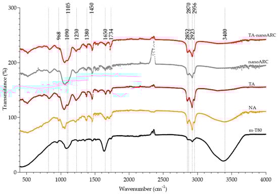 The FTIR spectra of TA-nanoARC, nanoARC, TA, and NA were dominated by poly-isoprenoid chain signals, common to TA (rich in NA, such as BR) and PA (rich in PA, such as PGP-Me) (Figure 4). No significant modifications were observed in the peaks from PA shown in Table 3, except in the ether stretching bands, which in TA-nanoARC and nanoARC were shifted toward lower wavenumbers, suggesting the establishment of hydrogen bonds between the glycerol skeleton of PA and Tween 80. The disappearance of the broad OH stretching band from Tween 80 in TA-nanoARC can also be attributed to the establishment of hydrogen bonding between Tween 80 and NA.