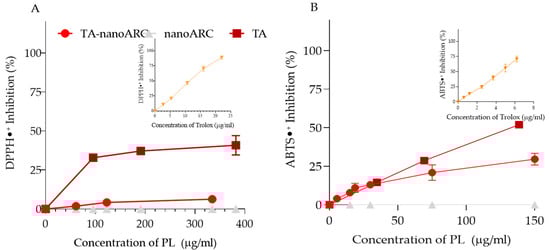 The ability of TA-nanoARC to reduce the DPPH radical was lower than that of TA, whereas nanoARC showed no activity (Figure 5A). These results were reasonable, since nanoARC lacks NA, and the content of BR in TA doubles the amount of BR in TA-nanoARC (9.43 vs. 4.4 μg BR/mg PL). Since the inhibitory activities of TA and TA-nanoARC were not linear with concentration, it was not possible to calculate an IC50 value. However, between 0.94 and 3.6 μg BR/mL, TA reduced by 35–40% the DPPH radical. In contrast, at 0.94 μg BR/mL, the antioxidant activity of TA-nanoARC was seven times lower. Such a difference suggests that BR in TA was oxidized along with TA-nanoARC manufacture. The inhibitory activity of Trolox was linear with concentration (see inset in Figure 5A), with an IC50 of 10.5 μg Trolox/mL. The IC50 of TA was 17.7 μg BR/mL, slightly higher than the 13.5 μg BR/mL previously reported for BR extract [].