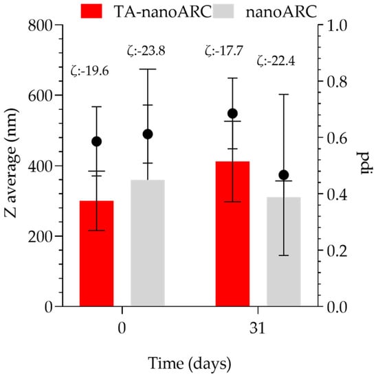 Both TA-nanoARC and nanoARC were stable in terms of size, polydispersity, and ζ potential after 31 days (Figure 6).