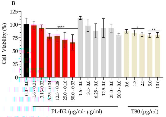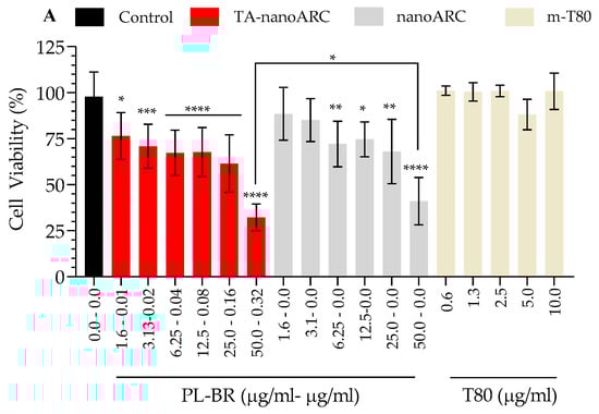 Figure 7 shows the effect of the formulations on the viability of A549 cells after 48 h. IC50 TA-nanoARC was 33.8 μg PL/mL (0.15 μgBR/mL), while the IC50 of nanoARC was ~50 μg PL/mL. TA-nanoARC was therefore ~1.5 times more cytotoxic than nanoARC. This difference can be attributed to the presence of NA in TA-nanoARC bilayers (Figure 7A, Table 5).