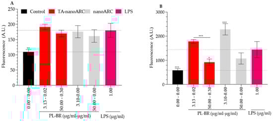 Neither TA-nanoARC nor nanoARC modified the minimal ROS induced by LPS in A549 cells compared to that produced in mTHP-1 (Figure 8A). Instead, both formulations (despite nanoARC containing no antioxidants) at 50 µg PL/mL, reduced the intracellular ROS in mTHP-1 (Figure 8B).