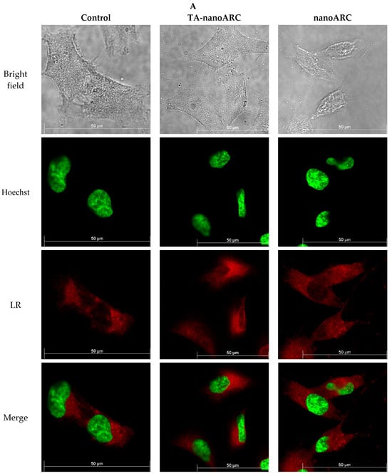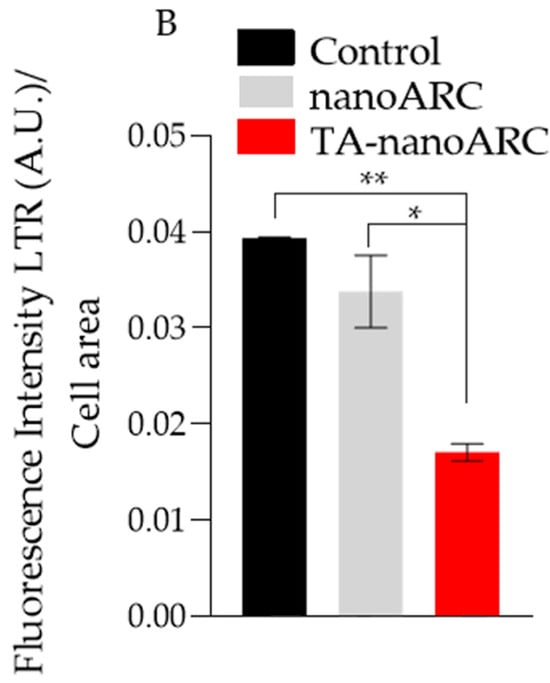 In Figure 10 it is shown that nanoARC caused no visible structural perturbation of lysosomes’ fluorescence, compared with the untreated control, except for the appearance of bright and small vesicles inside and outside the cells. TA-nanoARC, on the other hand, reduced the fluorescence intensity of the dye and blurred it over the cell cytoplasm.