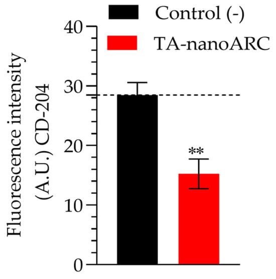 CD-204 fluorescence intensity on mTHP-1 cells incubated with A549 cell-conditioned media at 6.3 µg/mL phospholipids (PLs) of TA-nanoARC or nanoARC. Significance considered at ** p < 0.01.
