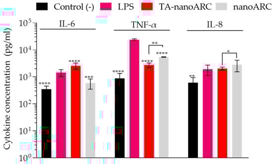 Proinflammatory cytokine production (IL-6, IL-8, and TNF-α) by mTHP-1 in response to conditioned media from A549 cells treated with TA-nanoARC, nanoARC, or culture medium as a negative control. LPS was used as a positive control. Treatment concentrations (µg/mL PL—µg/mL BR): Control: 0.00–0.00; TA-nanoARC: 6.30–0.04; nanoARC: 6.30–0.00; LPS (1 µg/mL). Statistical significance was assessed against LPS and between TA-nanoARC and nanoARC using a one-way ANOVA followed by Dunnett’s test, significance considered at * p < 0.05; ** p < 0.01 *** p < 0.001, **** p < 0.0001.