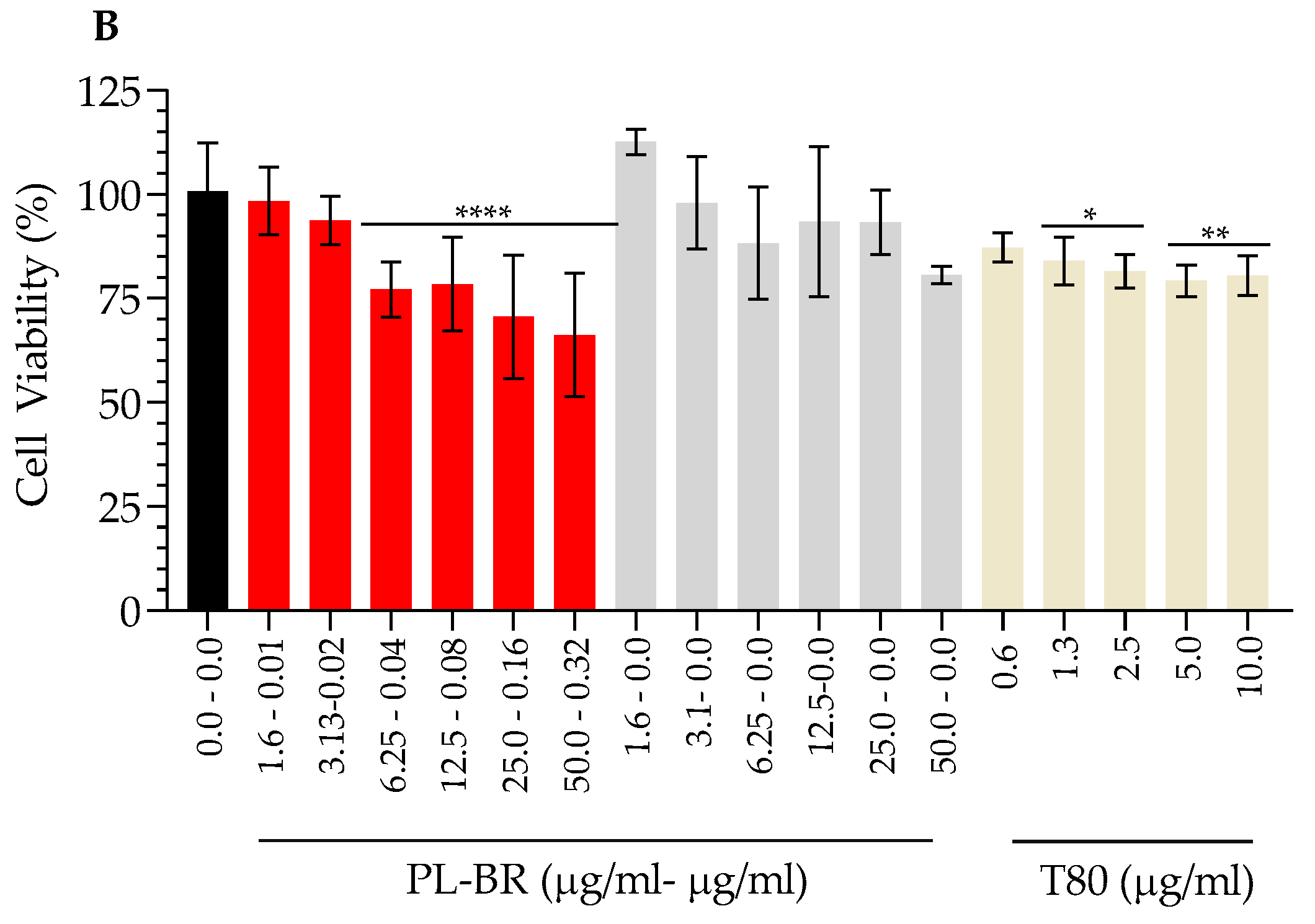 Cells | Formulation | IC50 (µg/mL PL—µg/mL BR) |