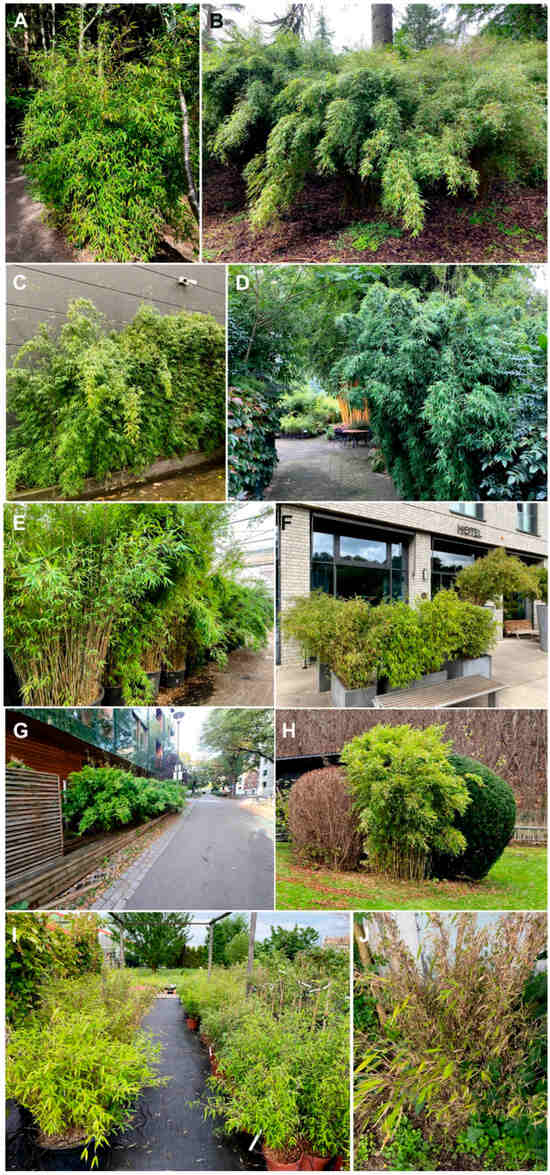 Sampling locations and host plants of Takecallis nigroantennatus in the introduced range. (A) Fargesia nitida in the RBG Edinburgh, UK. (B) Yushania aceps in the RBG Benmore, UK. (C) Fargesia sp. outside a garden center in Maldegem, Belgium. (D) Fargesia ‘Jiuzhaigou 1’ in Kimmei Nursery, The Netherlands. (E) Fargesia nitida ‘WinterJoy’ in Bamboo Giant Nursery, The Netherlands. (F) Fargesia sp. outside a hotel in Göttingen, Germany. (G) Fargesia sp. outside the Green House in Oslo, Norway. (H) Fargesia sp. in a private garden in Trondheim, Norway. (I) Fargesia murielae ‘Simba’ in a garden center in Siemianowice Śląskie, Poland. (J) Fargesia sp. in a private garden in Poznań, Poland.