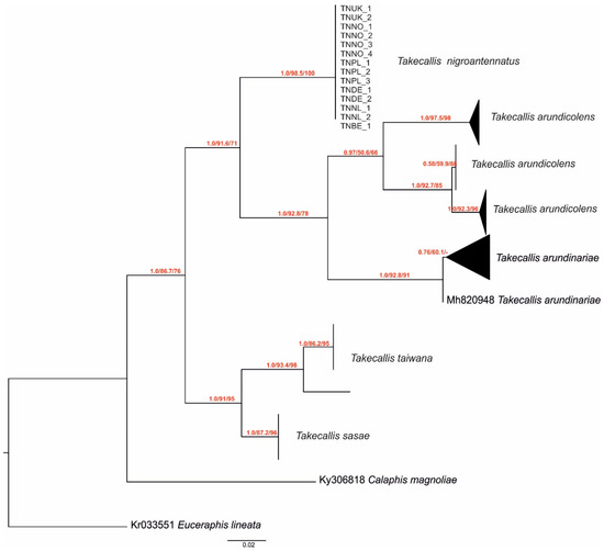 Phylogram displaying the phylogenetic position of all Takecallis nigroantennatus samples among Takecallis species, as determined by maximum likelihood (ML) and Bayesian inference (BI) analyses of cytochrome oxidase I (COI) gene sequences. Samples were collapsed to better visualize the phylogenetic tree. The first number on the branch is the posterior probability from MrBayes, the second is SH-aLRT support (%), and the third is the ultrafast bootstrap support (%) from IQ-TREE. Scale bar: expected substitutions per site.