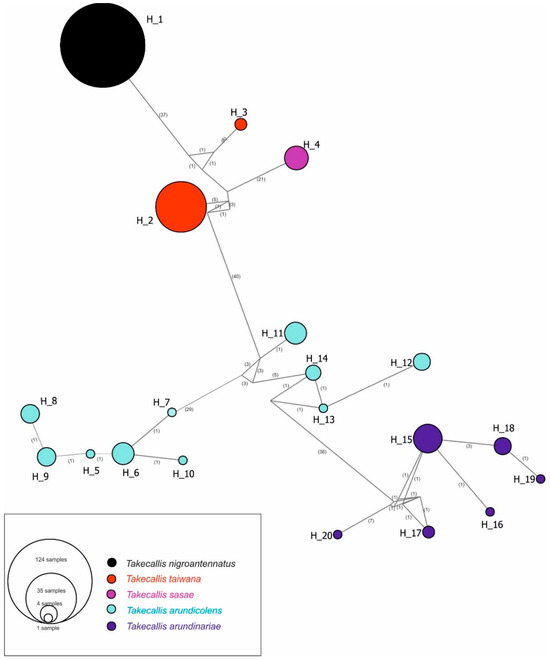 Haplotype analysis based on the COI matrix identified a total of 20 haplotypes. Among these, a single haplotype (H1) was found for all T. nigroantennatus individuals analyzed, indicating no intraspecific variation within this dataset. For reference, the GenBank sequences included two haplotypes for T. taiwana (H2, H3), one for T. sasae (H4), ten for T. arundicolens (H5–H14), and six for T. arundinariae (H15–H20). No geographical clustering of COI haplotypes was observed for T. nigroantennatus or any of the reference species (Figure 4).