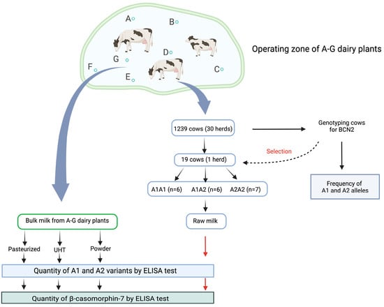 Workflow of experiments leading to measure the content of β-casein variants A1 and A2 as well as BCM-7 in the raw milk and popular processed dairy products. By A–G letters, 7 dairy plants are abbreviated.