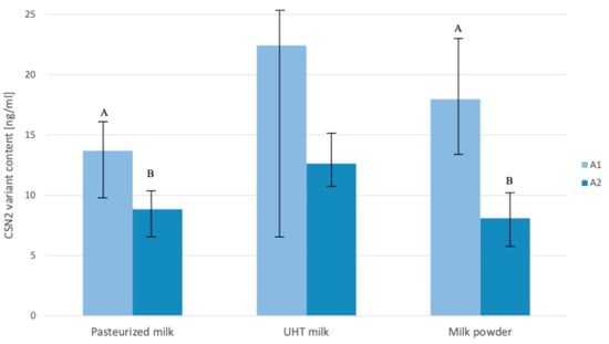 Relative content of β-casein A1 and A2 variants in raw milk and processed dairy products (pasteurized milk, UHT milk, and milk powder). Bars represent mean ± SD. Different superscript letters indicate significant differences (p < 0.01) among product types. Note: in UHT milk, difference between the content of A1 and A2 variants did not reach statistical significance (p > 0.05) due to high variability among samples. Different capital letters A and B indicate statistical significance between means at level p < 0.01.