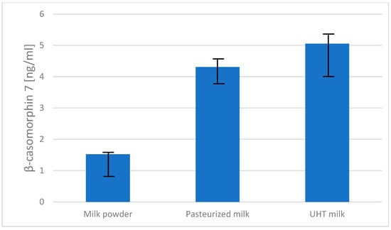 Concentration of β-casomorphin-7 in raw milk and processed dairy products (pasteurized milk, UHT milk, and milk powder), determined by ELISA. Bars represent mean ± SD.