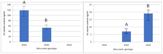 The concentration of the A1 variant in the milk of cows with the A1A1 genotype was significantly higher (118.78 ng/mL, SD = 25.48) than in the milk of cows with the A1A2 genotype (53.40 ng/mL, SD = 6.55). In the milk obtained from cows with the A2A2 genotype, the content of variant A2 was significantly higher (19.07 ng/mL, SD = 3.08) than in the milk from cows with the A1A2 genotype (7.02 ng/mL, SD = 2.99) (Figure 5).