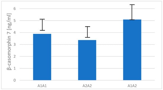 The same 19 samples of raw milk collected from cows with known β-casein genotypes were also used to detect variations in the amount of BCM-7. The results showed that milk from heterozygous A1A2 cows had the highest average BCM-7 content at 5.09 ng/mL (SD = 1.14), followed by A1A1 cows at 3.89 ng/mL (SD = 0.87). The lowest concentration of BCM-7 was found in the milk of homozygous A2A2 cows, with a mean value of 3.37 ng/mL (SD = 0.82), with no statistical differences (Figure 6).