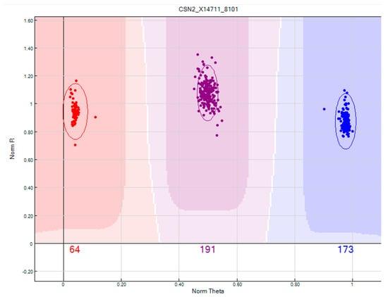 Since ancient times, cow’s milk and other dairy products have been regarded as almost wholesome foods that provide children and adults with many important nutrients []. Holstein-Friesian cattle are the most widespread breed in the world and produce milk as a raw material for a variety of dairy products []. Among milk proteins, caseins are the most important components of milk and play a crucial role in milk processing []. It is known that β-casein (CSN2), which is encoded by the CSN2 gene, accounts for up to 5% of the total caseins in bovine milk. At least 15 protein variants have been identified and characterized in cattle (A1, A2, A3, B, C, D, E, F, G, H1, H2, I, J, K, and L), of which A1 and A2 are the most common. I is less common, and B, A3, and C are rare [,,]. One of the most extensively studied variants is the nucleotide substitution X14711:g.8101C>A, which causes an amino acid change from proline to histidine at position 67 [].