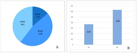 Frequency of CSN2 genotypes (A) and alleles (B) in the sample of 1239 Holstein-Friesian cows milked in the operating zones of dairy plants included in the study.