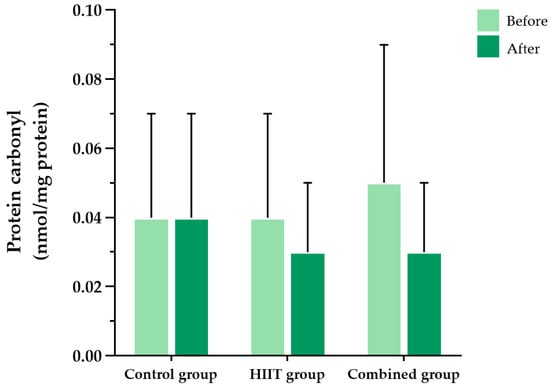 26] reported that HIIT reduces oxidative stress markers such as thiobarbituric acid-reactive substances and protein carbonyls, while simultaneously increasing antioxidant enzymes, including catalase and SOD. These observations align with our observations, in which significant reductions in MDA and protein carbonyl levels were evident in both the HIIT-only and HIIT plus