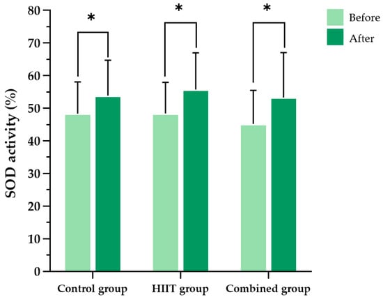 In this study, SOD levels increased across all experimental groups, even after controlling for potential confounders. The participants were instructed to maintain their usual physical activity and dietary habits throughout the study period, and to obtain at least seven hours of sleep per night, particularly on the night before the post-test. However, certain lifestyle factors that could influence antioxidant status—such as alcohol consumption, environmental exposures (e.g., pollutants, ultraviolet radiation), and medication use—were not restricted, in order to preserve ecological validity [
