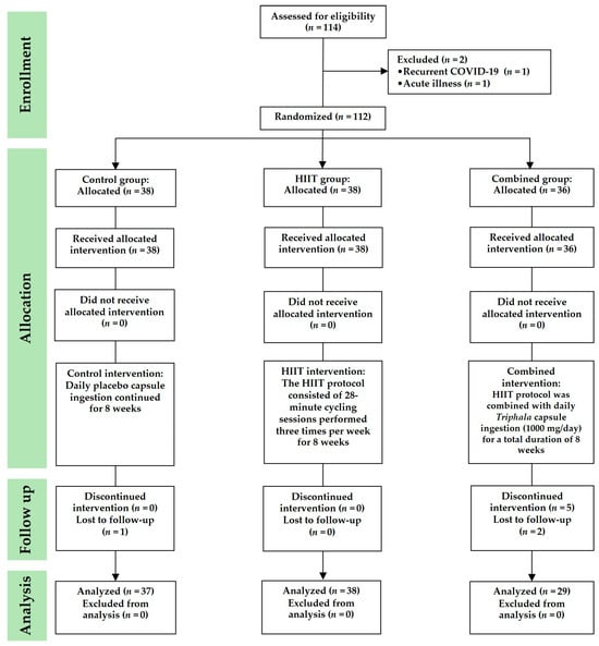 Eligible participants were male or female adults aged 18–59 years with a BMI between 18.5 and 24.9 kg/m2. All of the participants had previously tested positive for COVID-19 or had recovered from COVID-19 for at least four weeks and were free of active infection at the time of enrollment. Additionally, the participants exhibited persistent symptoms commonly associated with long COVID and post-exertional malaise, including fatigue, headache, difficulty concentrating, hair loss, and shortness of breath. The exclusion criteria included the following: (1) engaging in regular physical activity, defined as ≥2 sessions per week or ≥150 min per week; (2) regular use of dietary supplements; (3) smoking; (4) regular alcohol consumption, defined as more than one standard drink per day; (5) known food allergies, particularly to herbal ingredients such as Emblica officinalis, Terminalia chebula, or Terminalia bellirica; and (6) presence of any underlying medical conditions, including hypertension, diabetes, cardiovascular disease, cerebrovascular disease, respiratory disease, musculoskeletal disorders, cancer, liver or kidney disease, thyroid dysfunction, immune-related disorders, or other infectious diseases. Participants were also excluded if they had abnormal white blood cell counts or showed signs of active infection or inflammation, such as fever (>37.5 °C), pain, swelling, or redness. Termination criteria included the following: (1) initiation of dietary supplement use during the study period, (2) failure to comply with at least 80% of the prescribed exercise sessions, or (3) withdrawal of consent at any point during the study.