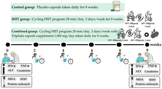 An 8-week intervention period was selected because previous studies have shown that cardiorespiratory fitness, oxidative stress markers, and metabolic regulation can improve within 6 to 8 weeks of structured HIIT [