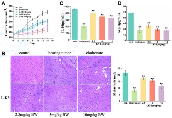 The lysine/leucine-rich peptide L-K5 has an inhibitory effect on mouse breast tumors. (A) Tumor volume of the mice. (B) Liver metastases by H&E staining; images were acquired at 100× magnification (10× objective lens) by Zeiss Axio Observer 7 microscope. (C,D) IL-10 and Arg-1 levels in mouse serum. The values presented are expressed as the means ± standard deviations (SDs) and are based on data obtained from three biologically independent samples. Compared to control: ** p < 0.01.