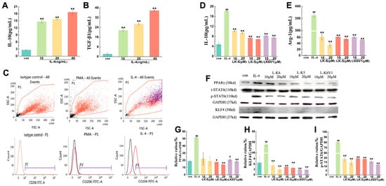 Peroxisome proliferator-activated receptor γ (PPAR-γ) and signal transducer and activator of transcription 6 (STAT6), along with Krüppel-like factor 4 (KLF4), induce each other and promote M2 polarization in IL-4-induced macrophages [,]. To understand the effects of lysine/leucine-rich peptides on M2 polarization in PMA-differentiated U937 macrophages, the expression levels of STAT6 signaling pathway proteins were detected via Western blotting. The results revealed that IL-4 increased PPAR-γ expression by 2.5 times the control group, but the three lysine/leucine-rich peptides at concentrations of 10 and 20 μM significantly downregulated the expression of PPAR-γ (p < 0.05) (Figure 2F,G). L-K5 exhibited the most significant inhibitory effect, with inhibition rates of 63.3% and 70.6% at peptide concentrations of 10 and 20 μM, respectively. L-K6V1 (10 and 20 μM) downregulated the expression of PPAR-γ by 56.1% and 61.8%, respectively, and by 53.4% and 60.2%, respectively, in response to L-K6. As shown in Figure 2F,H, IL-4 increased KLF4 expression by 6.7-fold compared to the control. However, KLF4 expression was downregulated by approximately 80% in IL4-induced U937 macrophages treated with 10 and 20 μM of L-K6, L-K5 and L-K6V1. The expression level of phosphorylated STAT6 (pSTAT6) was detected using Western blotting. We found that pSTAT6 was not expressed in the control group, but pSTAT6 was significantly increased after the addition of IL-4, which indicated that M2 macrophages had formed at this time (Figure 2F,I). The three lysine/leucine-rich peptides at concentrations of 10 and 20 μM significantly downregulated the expression of pSTAT6 (p < 0.05). L-K5 at peptide concentrations of 10 and 20 μM reduced the phosphorylation of STAT6 by approximately 76%, and 10 and 20 μM L-K6 and L-K6V1 downregulated the expression of pSTAT6 by 80–85%. Taken together, these three lysine/leucine-rich peptides downregulated the protein expression of the STAT6 signaling pathway to inhibit the development of IL-4-induced M2-type macrophage polarization.