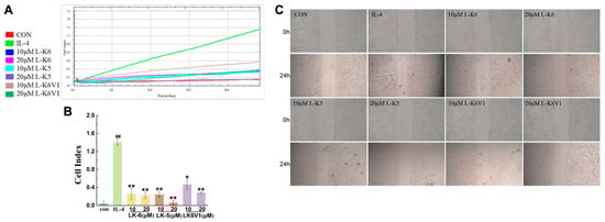 The above results revealed that lysine/leucine-rich peptides suppressed M2-type macrophage polarization. The effects of lysine/leucine-rich peptides on the migration of human breast cancer MCF-7 cells mediated by M2-type macrophages were investigated in a coculture system. First, the cytotoxic effects of the peptides on MCF-7 cells were assessed. The results revealed that the viability of MCF-7 cells was greater than 80% after treatment with 10 and 20 μM of L-K6, L-K5 and L-K6V1, which indicated the low cytotoxicity of the three peptides to MCF-7 cells (Figure S1B). Second, real-time cell analysis (RTCA) was used to evaluate the effects of the peptides on the migration of MCF-7 cells. PMA-differentiated U937 macrophages were treated with IL-4 in the absence or presence of 10 and 20 μM of L-K6, L-K5 and L-K6V1 for 24 h to induce the polarization of M2 macrophages. The various collected conditioned media were subsequently incubated with the MCF-7 cells in the RTCA pore plate, and the number of migrating cells was monitored in real time. As shown in Figure 3A,B, IL-4-induced macrophages promoted the migration of MCF-7 cells. However, the lysine/leucine-rich peptide-treated macrophages significantly reduced the migration of MCF-7 cells compared to the IL-4 group. The polarized M2 macrophages treated with 10 and 20 μM L-K5 reduced MCF-7 cell migration by 80.8% and 95.1%, respectively. Treatment with 10 and 20 μM L-K6 reduced migration by 79.5% and 82.1%, respectively, and treatment with 10 and 20 μM L-K6V1 reduced migration by 62.9% and 77.4%, respectively. Similarly, treatment with the three peptides markedly inhibited the migration of MCF-7 cells in the scratch assay (Figure 3C). These results suggested that the lysine/leucine-rich peptides suppressed macrophage-mediated tumor cell migration.