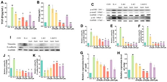 Lysine/leucine-rich peptides suppress the migration of breast cancer MCF-7 cells by downregulating the expression of signaling proteins. (A,B) Cytokines TGF-β and EGF are secreted by tumor cells. (C–F) Western blot analysis revealed the effects of lysine/leucine-rich peptides on the phosphorylation levels of the signaling proteins mTOR, Smad and ERK. (G,H) RT-qPCR was used to measure the mRNA levels of the snail and twist genes. (I–K) Western blot analysis revealed the effects of lysine/leucine-rich peptides on the phosphorylated levels of signal proteins vimentin and E-cadherin. The values presented are expressed as the means ± standard deviations (SDs) and are based on data obtained from three biologically independent samples. Compared to IL-4 group: * p < 0.05, ** p < 0.01, ## p < 0.0001.