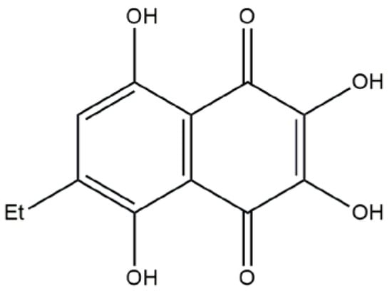 It has been previously shown that compounds U-443 (acetylated 1,4-naphthoquinone-O-glucoside) and the natural pigment of the sea urchin Scaphechinus mirabilis. U-573 (6-ethyl-2,3,5,8-tetrahydroxy-1,4-naphthoquinone (ethylspinazarin)) are able to protect mouse neuroblastoma Neuro-2a cells from the toxic effects of rotenone in vitro []. This compound also reduced the levels of reactive oxygen species (ROS) and nitric oxide (NO) in neuronal cells and had antioxidant properties. U-443 and U-573 also restored mitochondrial cell functions (mitochondrial potential) under the influence of neurotoxins. This compound significantly reduced the production of pro-inflammatory cytokines TNF and IL-1β, and it inhibited the activity of the pro-inflammatory enzyme cyclooxygenase-2 (COX-2). In vivo studies have shown that the treatment with U-443 and U-573 significantly improves behavioral responses of animals at the early stage of rotenone-induced Parkinson’s disease [,].