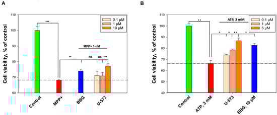 U-573 increases the viability of Neuro-2a under toxic treatment. The effect of U-573 on the viability of Neuro-2a cells under the action of MPP+ (1 mM) (A) and ATP (3 mM) (B). Data are presented as mean ± SE (n = 6). * p < 0.05, ** p < 0.01, *** p < 0.001 compared to MPP+ or ATP; ns—not significant.