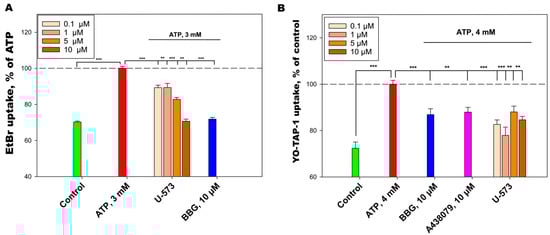 U-573 inhibits ATP-induced uptake of EtBr (A) and YO-TAP-1 (B) in Neuro-2a cells. Data are presented as mean ± SE (n = 6). ** p < 0.01, *** p < 0.001 compared to ATP.
