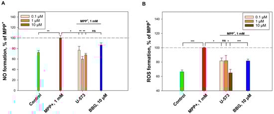 It was demonstrated that the addition of MPP+ (1 mM) increased the formation of nitric oxide by 27.5%. Compound U-573 significantly reduced NO production at concentrations of 0.1, 1, and 10 μM by 23.1%, 40.1%, and 32.1%, respectively. Meanwhile, BBG inhibited NO formation by 13.3% (Figure 5A).