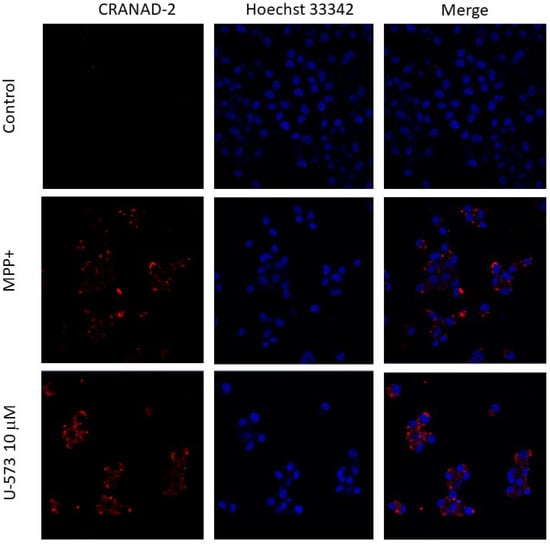 Protein aggregation in Neuro-2a cells in intact cell culture (Control), in the presence of MPP+ (1 mM), or MPP+ and U-573 (10 μM). Images of neuronal cells were obtained using a laser scanning confocal microscope LSM 710 LIVE AxioObserver at 40× magnification after cell staining with CRANAD-2. Cell nuclei are shown in blue (Hoechst 33342).