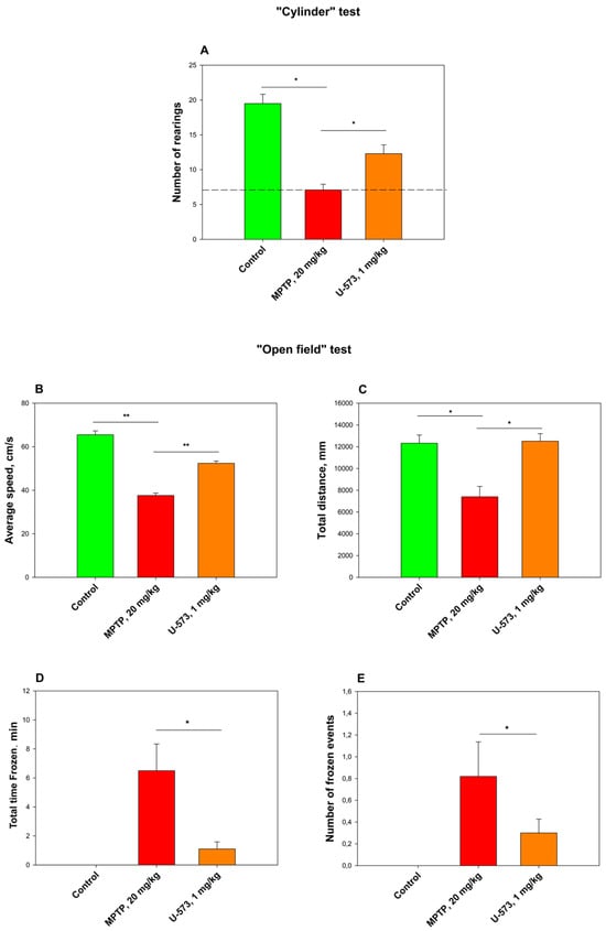 Effect of U-573 on spontaneous locomotion in MPTP-induced Parkinson’s disease mice. Effect of U-573 on the number of rearing of mice after MPTP administration in the “Cylinder” test (A), as well as on the average mouse speed (B), total distance traveled (C), total time in a frozen state (D), and the number of freezings in the “Open Field” test (E). U-573 was applied at a dosage of 1.0 mg/kg. Data are presented as mean ± SD (n = 6), * p < 0.05, ** p < 0.001 compared to the group of mice treated with MPTP alone.